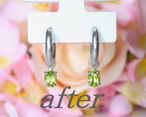 NO278 お客様がお持ちになられたのはグリーンガーネットのペンダントトップです。Beforeの写真を撮り忘れてしまいましたが、縦に5粒並んだペンダントトップでした。二つずつに分けてピアスへとリフォーム。グリーンが爽やかな、縦長の揺れるピアスへと生まれ変わりました!いつもご注文いただきありがとうございます(^-^) |
