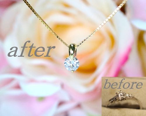 | NO484 お客様がお持ちになられたのはゴールドのダイヤリングです。デザインは変えずに、向きを少し調整してペンダントトップへとリフォームさせていただきました。シンプルなリフォームですが、出来上がりが想像しやすく、間違いのないリフォームです。気分を変えたいとき、愛用しているジュエリーの面影は残したい方にオススメ!素敵なジュエリーをお持ちの方はぜひ当店にご相談ください(^^)ご依頼いただき、誠にありがとうございました。 |