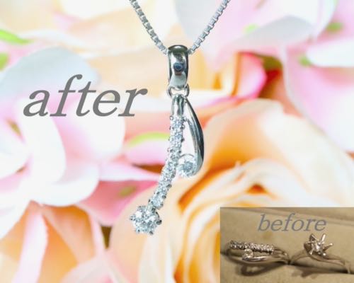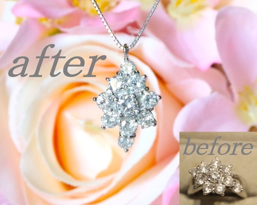 | NO516 お客様にお持ち込みいただきましたのはブライダルリング。元の雰囲気は残しつつ、ペンダントにリフォームしたいとのご要望でした。リングのトップ部分のデザインをそのまま生かしつつ、シンプルなペンダントへとリフォーム。どんな場面でも活躍できるペンダントへと生まれ変わりました。この度は当店でのご注文誠にありがとうございました(^^) |
