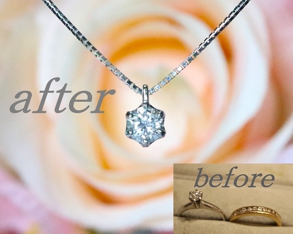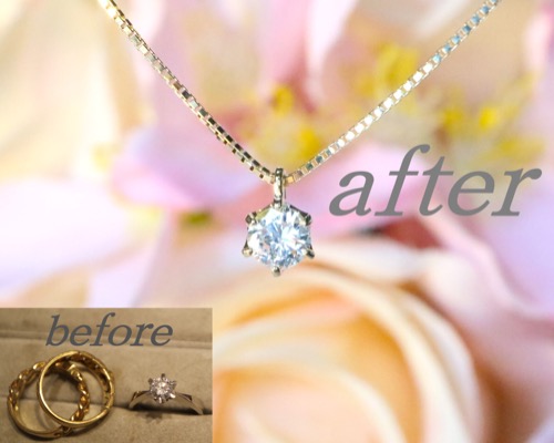 | NO484 お客様がお持ちになられたのはゴールドのダイヤリングです。デザインは変えずに、向きを少し調整してペンダントトップへとリフォームさせていただきました。シンプルなリフォームですが、出来上がりが想像しやすく、間違いのないリフォームです。気分を変えたいとき、愛用しているジュエリーの面影は残したい方にオススメ!素敵なジュエリーをお持ちの方はぜひ当店にご相談ください(^^)ご依頼いただき、誠にありがとうございました。 |