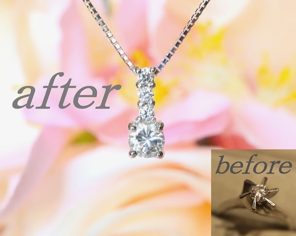 | NO465 ご紹介するのは立爪リング→一粒ダイヤペンダントへのリフォームです。一番人気のリフォームで失敗のないリフォーム間違いなしです!自分でつけるのはもちろん、娘さんへのプレゼントにも、お嫁さんへ譲り渡すにしても喜ばれるデザインだと思います(^^)使っていない一粒ダイヤをお持ちの方はぜひ当店へ!当店へのご依頼、誠にありがとうございました。 |