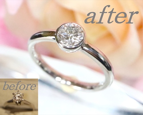 | NO499 主張の大きい立爪リングから、爪のないタイプのリングへのリフォームのご紹介です。 Beforeの爪は鬼爪と呼ばれる止め方です。ダイヤの輝きを活かすため高さを出したリングですが、その高さのせいでつけにくいという方が多くいらっしゃいます。今回リフォームさせていただいたデザインはそんな方にピッタリのデザイン。引っ掛かりを気にすることなく、どんどんつけていただけるデザインです。長く受け継がれてきたダイヤだからこそ、たくさんつけて楽しんでいただけたら幸いです。この度は本当にありがとうございました。 |