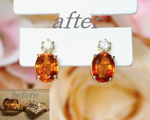 | NO322 こちらは一本のリングを分けて、ピアスとリングにリフォームさせていただきました。もともと素敵なリングでしたが、豪華な雰囲気が逆につける機会を減らしてしまうことがよくあります。そんな時は二つに分けて選択肢を増やしましょう!ピアスとリングのセットにすれば、コーディネートの統一感もバッチリ!それぞれで分けて着けても楽しめます。つけるのをためらってしまうジュエリーをお持ちの方はぜひご相談を(^^)当店でのご注文、誠にありがとうございました。 | |