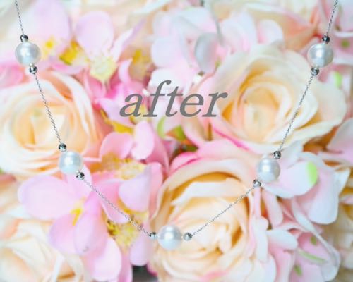 | NO375 こちらはパールのチョーカーをばらしてステーションネックレスに組み換えさせていただいたもののご紹介です。パールのチョーカーは質の良いパールをふんだんに使っているのに使い道が限定されてもったいない!使う機会が減ってきたなら思い切ってリフォームしてしまうのもおすすめです(^^)ダイヤや色石のような輝きも素敵ですが、パールのやわらかな輝きも素敵ですね。ご依頼いただきまして、誠にありがとうございました。 | |