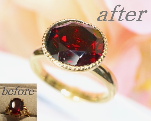 | NO381 こちらは大粒ガーネットのリングリフォームのご紹介です。リフォーム前のデザインが高さのある爪留めという少し使いにくいデザインでしたので、爪のないやや高さを抑えたデザインにリフォームさせていただきました。いろいろな場面での活躍を期待しております(^^)ご注文いただきまして、誠にありがとうございました。 |
