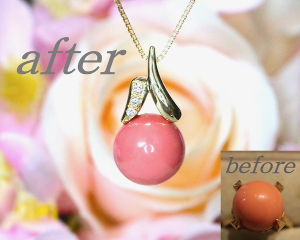 | NO294 こちらはピンクサンゴのトップリフォームのご紹介です。リングトップのデザインをそのままペンダントに移行したペンダントリフォーム。石自体の存在感があるので余計な装飾をしないことで、コーディネートしやすいペンダントに生まれ変わりました。カボッションカットの優しい雰囲気を楽しんでいただければ嬉しいです(^^)当店でのご注文、誠に有難うございました。 | |
