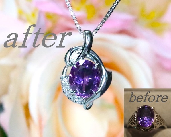 | NO307 お客様がお持ちになられたのはアメジストのリングです。大粒の色石は主張が大きい分、リングではつけるのをためらうという方が増えてきています。そんな時は思い切ってペンダントにリフォームがオススメ!ペンダントならサイズも関係ないですし、長さの調節できるチェーンにすれば身に着ける頻度も大幅アップ間違いなしです(^^)使っていない大粒の色石をお持ちの方はぜひご一考ください。ご依頼いただき誠にありがとうございました。 | |