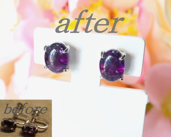 | NO383 お客様がお持ちになられたのはアメジストのイヤリング。デザインはそのままでピアスへとリフォームさせていただきました。「使いたいんだけど、今のままだとちょっと不便…」というお悩みをお持ちの方はぜひ当店へ!経験豊富なスタッフがお客様に合ったご提案をさせていただきます(^^)お気軽に足をお運びくださいね!ご依頼いただきまして、誠にありがとうございました。 |