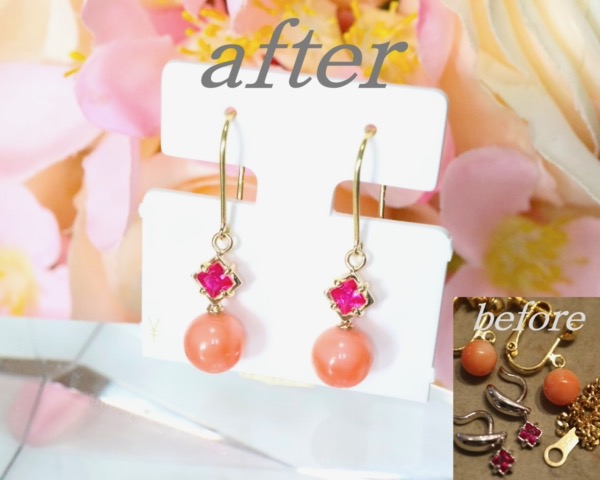 | NO384 複数のジュエリーをまとめてワンセットのピアスへリフォームさせていただきました。サンゴのピンクを暖色系の色合いでまとめ、フック式のピアスに。動きに合わせて自然に揺れる可愛らしいピアスに仕上がりました。使わなくなってしまったピアスやチャームも組み合わせることで新しい顔を見せてくれますね(^^)使わなくなったジュエリーをお持ちの方はぜひ当店にお持ち込みください!ご依頼いただきまして、誠にありがとうございました。 |