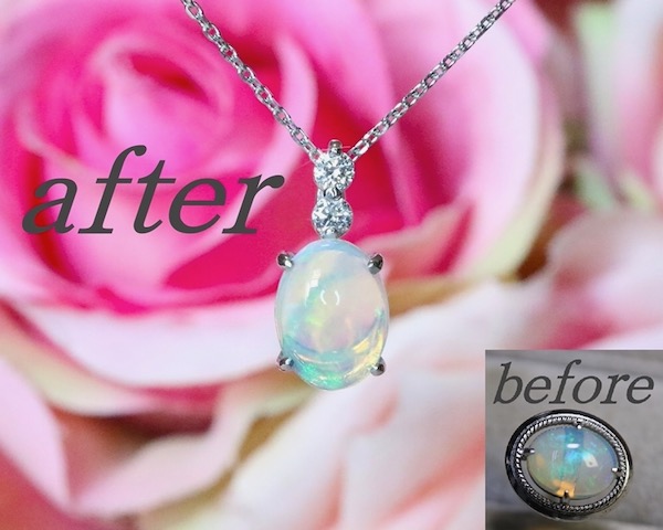 | NO305 お客様がお持ちになられたのは、昔ながらのオパールリング。リングからペンダントにリフォームして使いやすくしてほしいとのご要望でした。今回ダイヤは添えずにシンプルなデザインにリフォーム。普段から使いやすいペンダントへと生まれ変わりました(^^)最近人気のオパールリフォーム、オパールを持て余している方はぜひ当店にご相談くださいね(^^)ご注文いただき、誠にありがとうございました。 | |