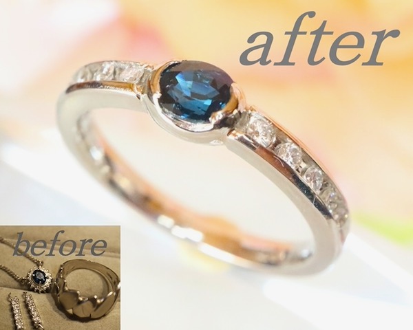 | NO379 お客様がお持ちになられたのはサファイヤのペンダントと使わなくなったリング等。 一つにまとめ、ダイヤとサファイヤのマッチングが素敵なリングへとリフォームさせていただきました。シンプルなデザインではありますが長く楽しんでいただけるデザインです。アフターケアもしっかり行いますので、お気軽にお申しつけくださいね(^^)ご注文頂きまして、誠に有難うございまし |
